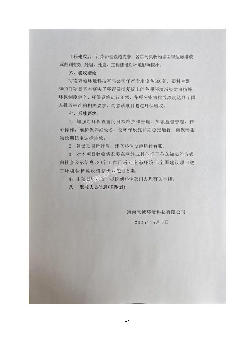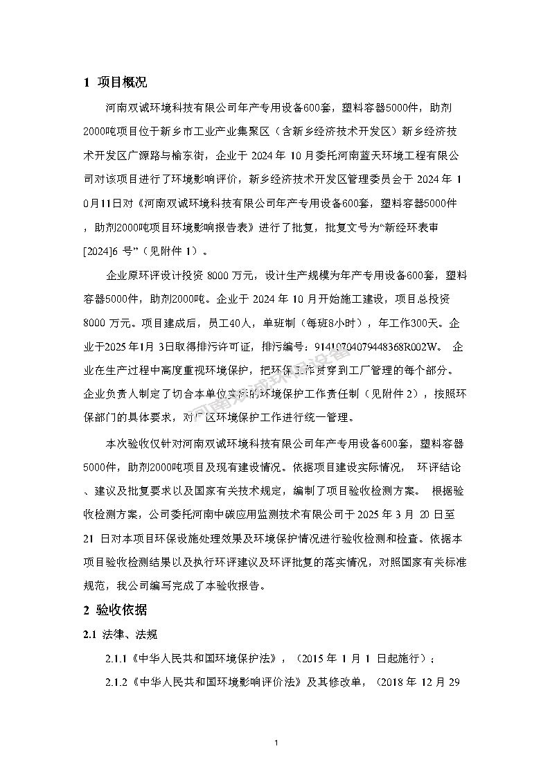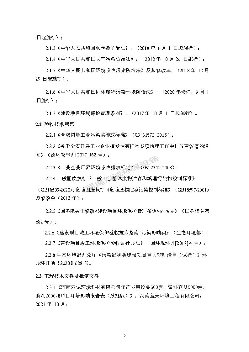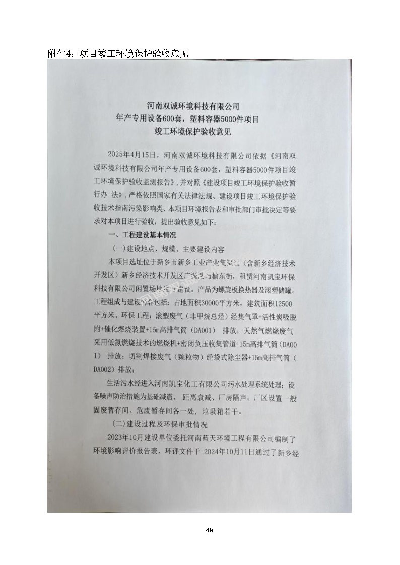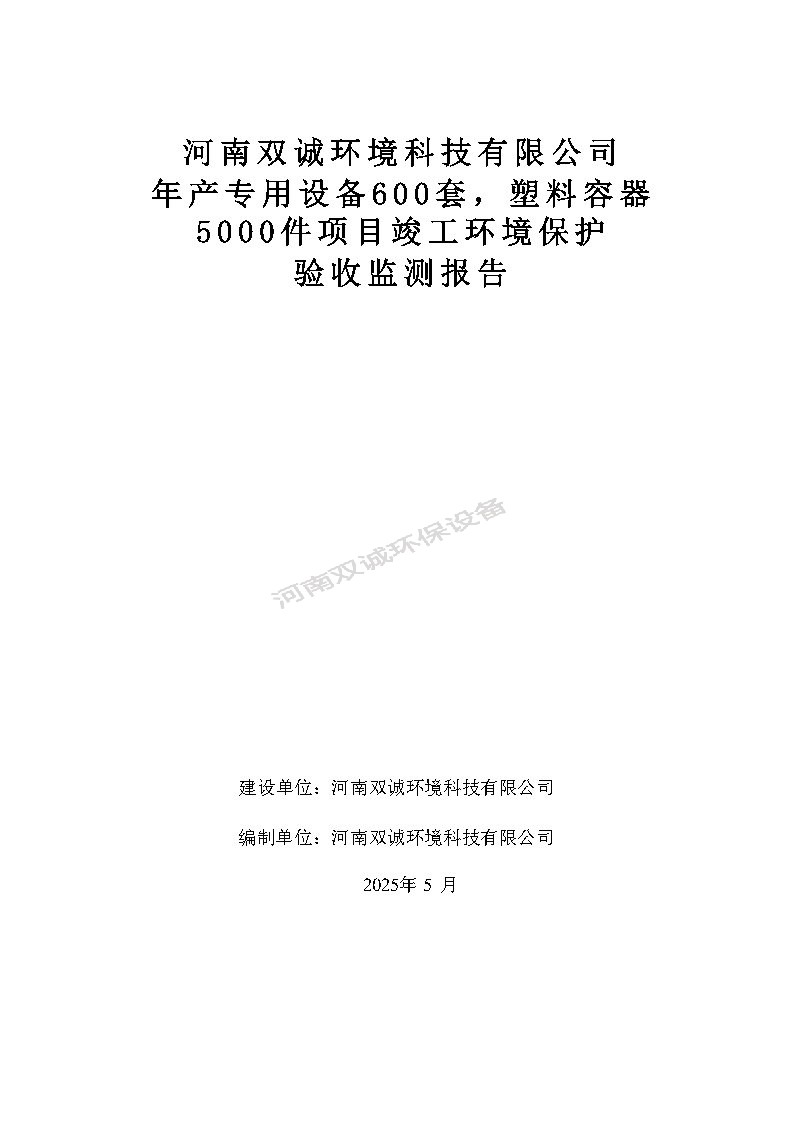 河南雙誠環(huán)境科技有限公司 年產(chǎn)專用設(shè)備600套,塑料容器5000件項目竣工環(huán)境保護 驗收監(jiān)測報告